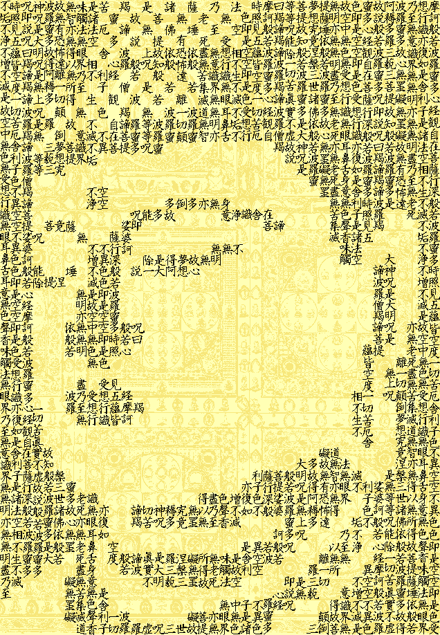 観自在菩薩行深 般若波羅蜜多時 照見五蘊皆空 度一切苦厄 舎利子 色不異空 空不異色 色即是空 空即是色 受想行識 亦腹如是 舎利子 是諸法空相 不生不滅 不垢不浄 不増不減 是故空中 無色無受想行識 無眼耳鼻舌身意 無色聲香味觸法 無限界乃至無意識界 無無明亦無無明盡 乃至無老死 亦無老死盡 無苦集滅道 無智亦無得 以無所得故 菩提薩垂 依般若波羅蜜多故 心無堯礙 無堯礙故 無有恐怖 遠離一切転倒夢想 究境涅槃 三世諸佛 依般若波羅蜜多故 得阿耨多羅三藐三菩提 故知般若波羅蜜多 是大神呪 是大明呪 是無上呪 是無等等呪 能除一切苦 眞實不虚 故説般若波羅蜜多呪 即説呪曰 羯諦羯諦 波羅羯諦 波羅僧羯諦 菩提薩婆訶 般若心経