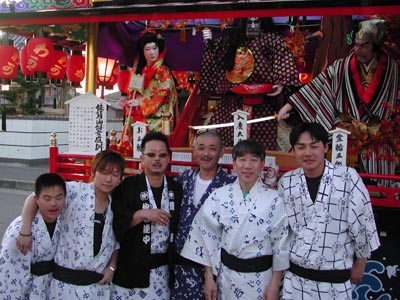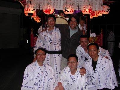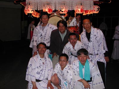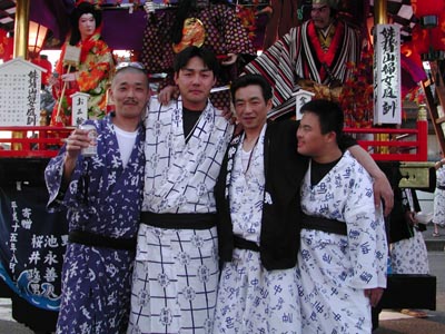 ![]() −2−仲町の山車バックに撮ったショット2。一見怖そうな人達ですが、根 は優しい。でも見た目は怖そう。なんじゃそら。 |