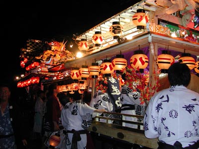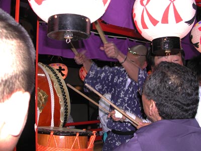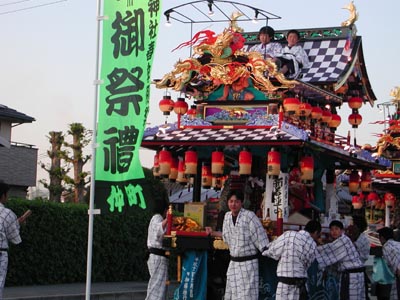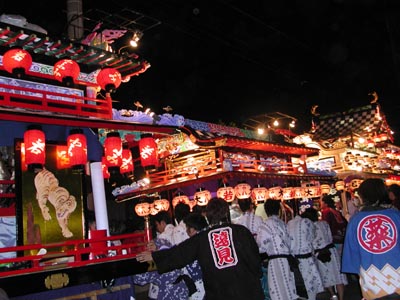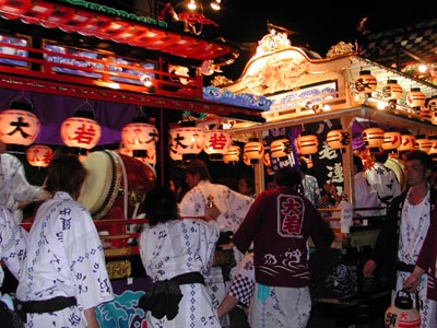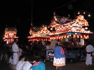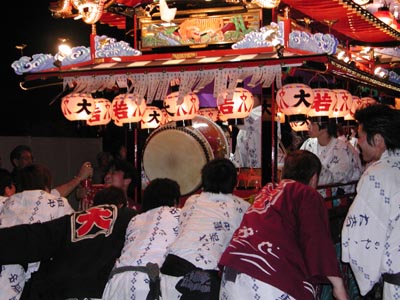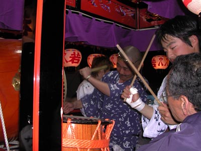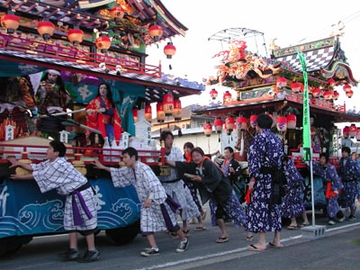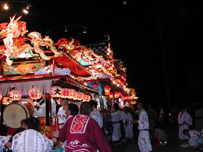 ![]() −9−これは場所どこだ?新港のどこかは間違いない。町のどこかでしょう ね。手打ち直後の様子です。左の一台は本町の山車でしょうか? |