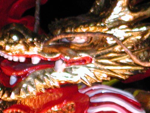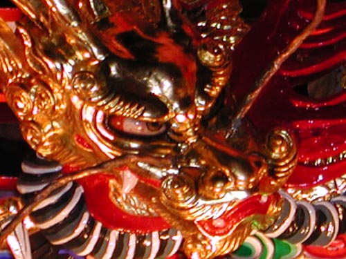 「仲若」大屋根下右側の彫り物。松や腕木細工の彫刻が彩色で復活しました。 |