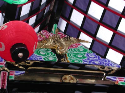 ![]() -13-上若の大屋根後ろの彫刻です。 鳳凰か、鷹か、雉か、朱鷺か。 |