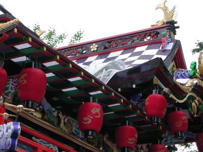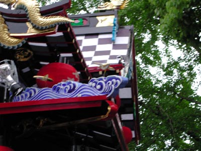![]() -41-下若の後ろからのショット。 山車のサイズに比べ大屋根がでかい。紙一枚分でかい。かっこいい。 |