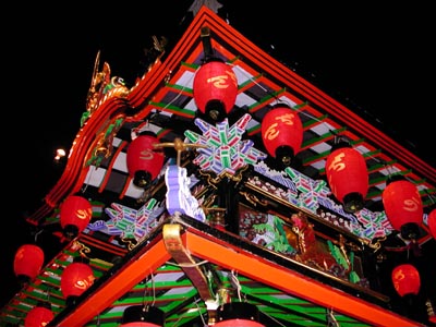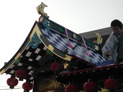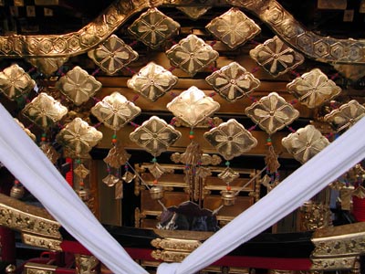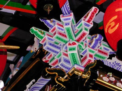 ![]() -15-同じく新町。大屋根後方斜め真下より。綺麗のひと言ですね。ここの桟の緑は黄緑っぽい色なので、いいと思います。ビリジアン系の緑は山車が暗くなっていけません。 |