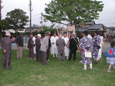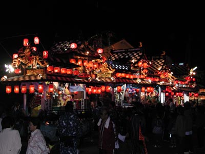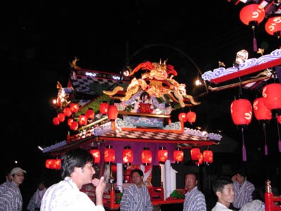 ![]() -33-神事後の山車が並んだショット。海原の祭りのすごいところの一つは、三佐が忘れた伝統をいまだに守っている点です。お旅所である龍神社に一晩泊めてますから。 |