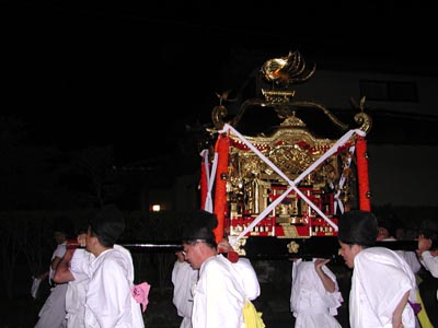 ![]() -23-このショットの意味は。暗闇をたんたんと進む神輿を撮りたかったのです。フラッシュで明るいのですが、実は真っ暗でした。はまや交差点直前。 |