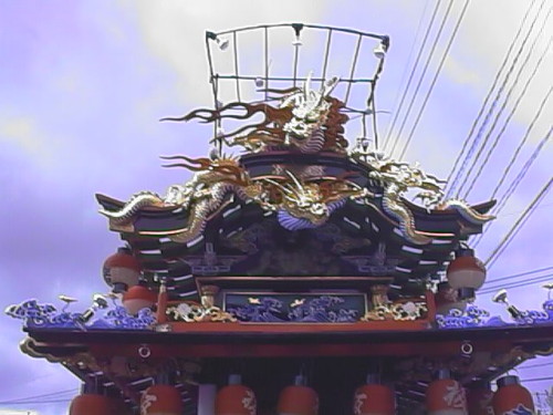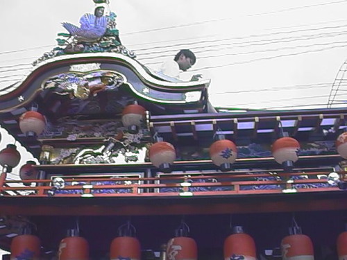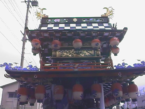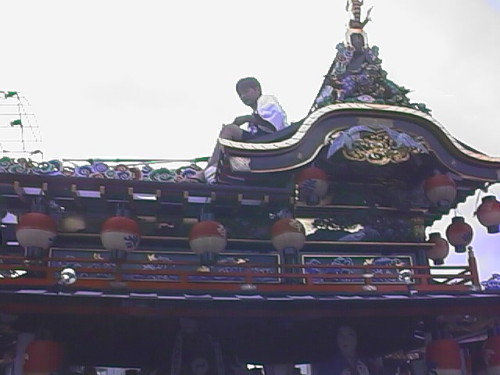 ここの山車の最大の特徴の一つは、大屋根の形態が「唐破風」作りになっていることです。この作りは珍しく、他の例としては海原の新町の山車ぐらいのものでしょうか。多くの人形山車の大屋根は三角形の「千鳥破風」です。