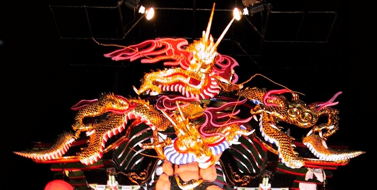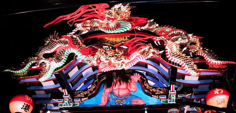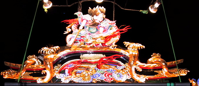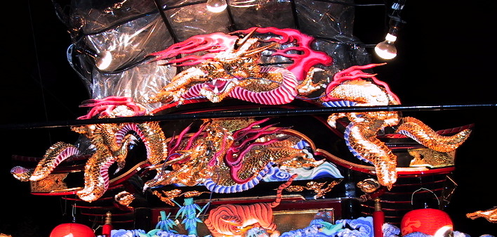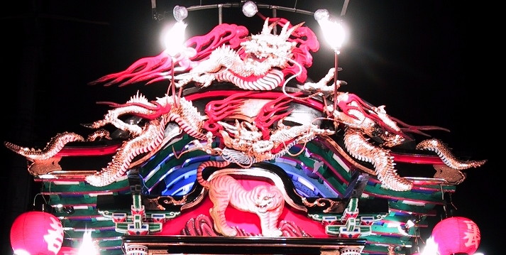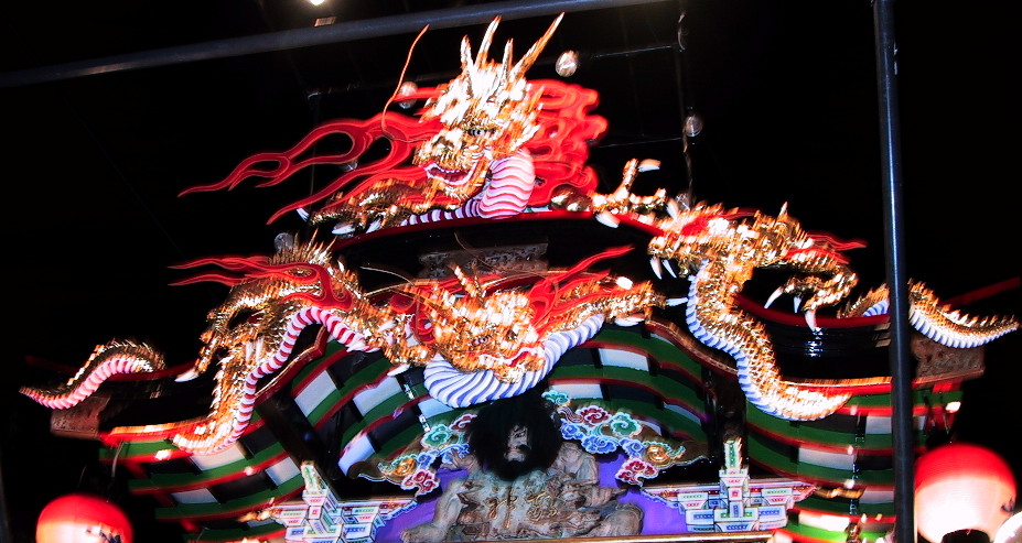 各山車のシンボルともいえるものです。どの山車の作者も勇ましく見える工夫をしています。真横から見ると、龍等を取りつけている大きな背板は少し前方に傾斜しており、山車を見る者ができるだけ龍を正面から見れるようにした工夫の一つです。各山車の龍は少しずつ違いが見られます。夜の龍が多いですが、まーゆっくりとご覧ください。(コメントについてはわたしの独断的見解ですので悪しからず、、、)