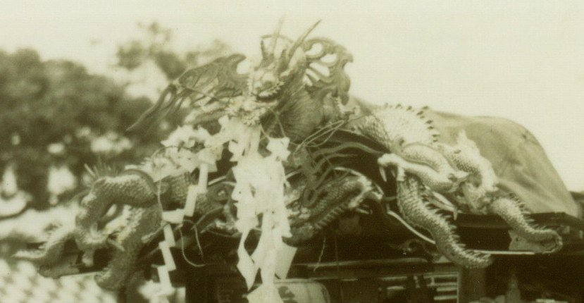 | 太鼓山車 | 大村 | はい、わたしの地区の山車です。ちょっと変わったところを見せたくて白黒を用意いたしました。なんと昭和39年の祭りのときの集合写真です。場所は恐らく沖の境内だと思いますが、、、わかりません。龍および山車は昭和32年板屋町の河村辰夫氏の手によるものです。太鼓山車は他地区数多くありますが、小ぶりですが、かっちとまとまっていて、バランスが極めてよいのはうちの山車だけです。と勝手に自慢してます。さて、龍の特徴としては、太鼓山車にしては立派な大きさの龍です。残念ながら写真にある各細部のパーツは現在落ちているものが多いです、、、 角も途中で変わったらしく現在のものと違い、オリジナルはかなり後方に反った形です。全体的にもうかなりガタがきてまして(まーこれは引き回すお供山車の運命ですが)、そろそろ平成の山車を作ってほしいところです。 |