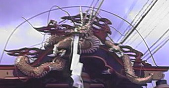 | 〃 | 裏町 | ここの龍の最大の特徴は、基本的な龍の配置と顔の位置をきっちりと守って作られているという点でしょう。言い換えれば龍の代表的な形を一番表わしているとも言えます。ここの龍の体はわりと細身でありながら、しっかりと尻尾まで大屋根を巻き込んでいます。力士は居ず虎が守護神となっています。龍もそうですが、山車全体が多少色落ちしてます。少々残念です。とってもいい山車だけに惜しいと思いませんか?皆さん?あ、そうそう忘れてました、この山車のすごいとこはガス燈にあります。山車は数多いですが、ここだけですよ!ガス燈をつけている山車は。写真では分かりにくいですが、全面にも2基ついています。風流ですなー。最後に一言、裏町の山車は新港に次いでわたしの大好きな山車の一つです。 |